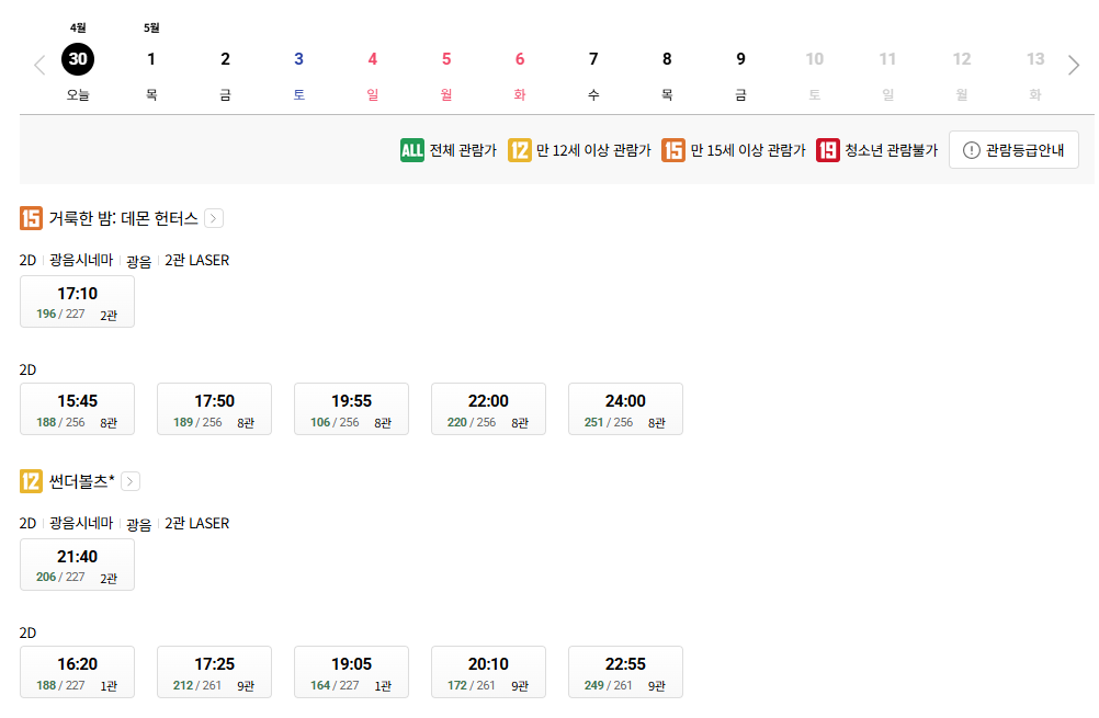 - 지점과 날짜를 설정하면, 해당 지점의 모든 상영작과 시간을 시간대별로 확인할 수 있습니다.